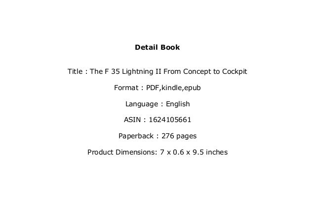 From Concept to Cockpit is to tell that story - a full spectrum history of the design development and verification of the F-35 Lightning II as described by the engineers scientists and managers who were intimately involved throughout the development program. The F 35 Lightning II From Concept to Cockpit Format. From Concept to Cockpit is to tell that story -- a full-spectrum history of the design development and verification of the F-35 Lightning II as described by the engineers scientists and managers who were intimately involved throughout the development program.